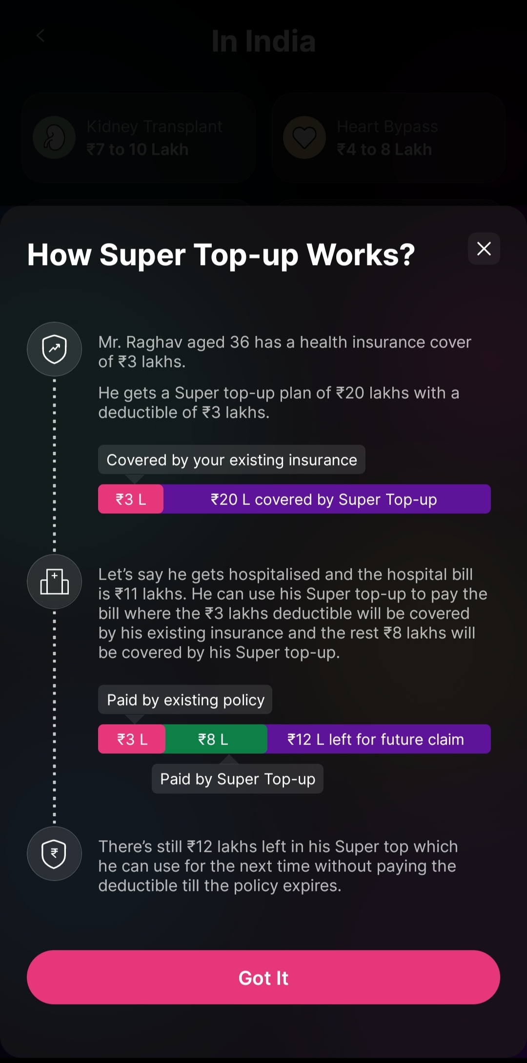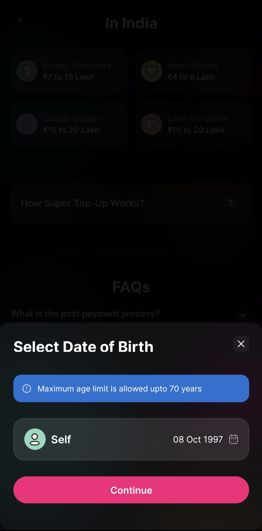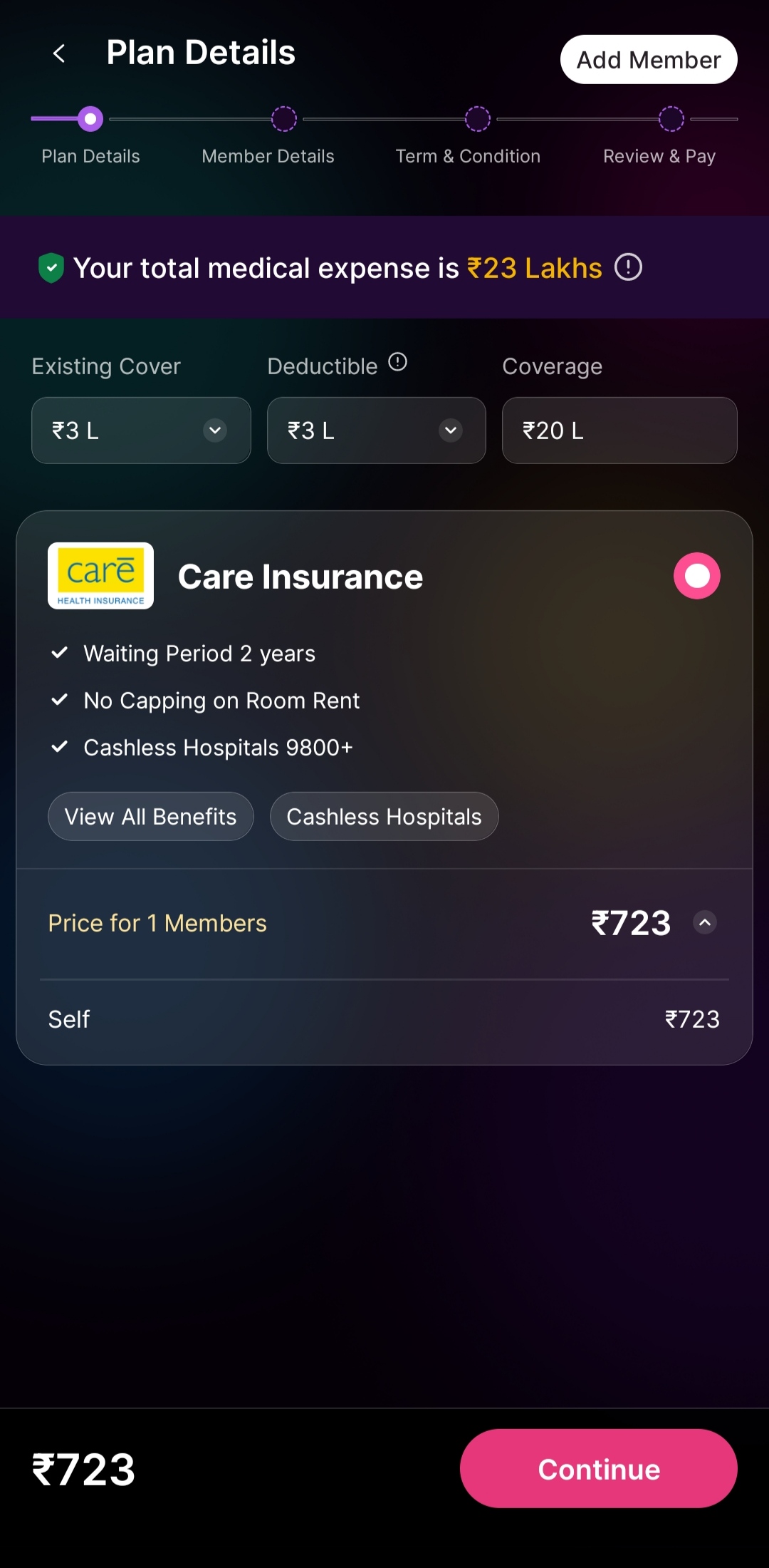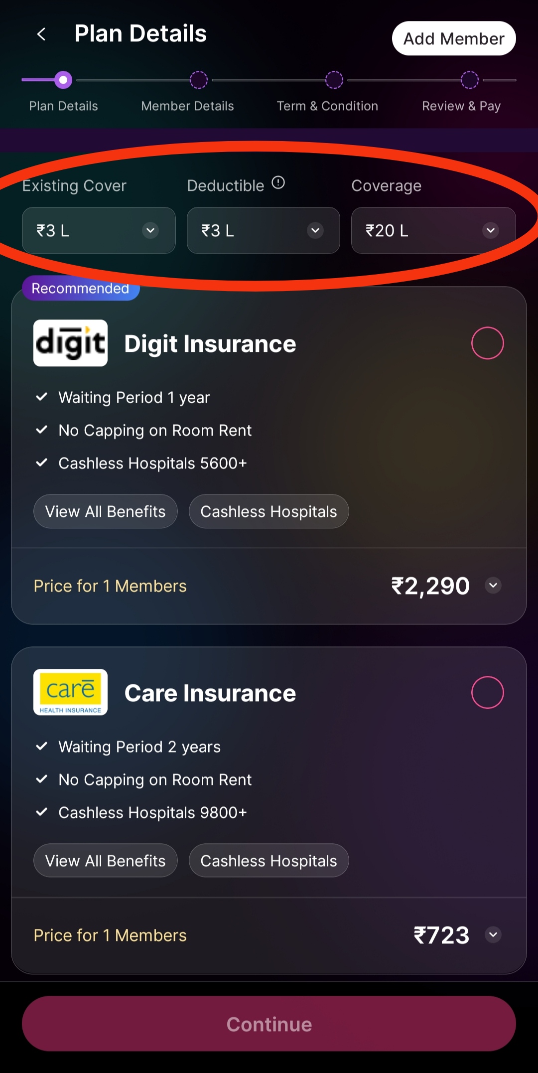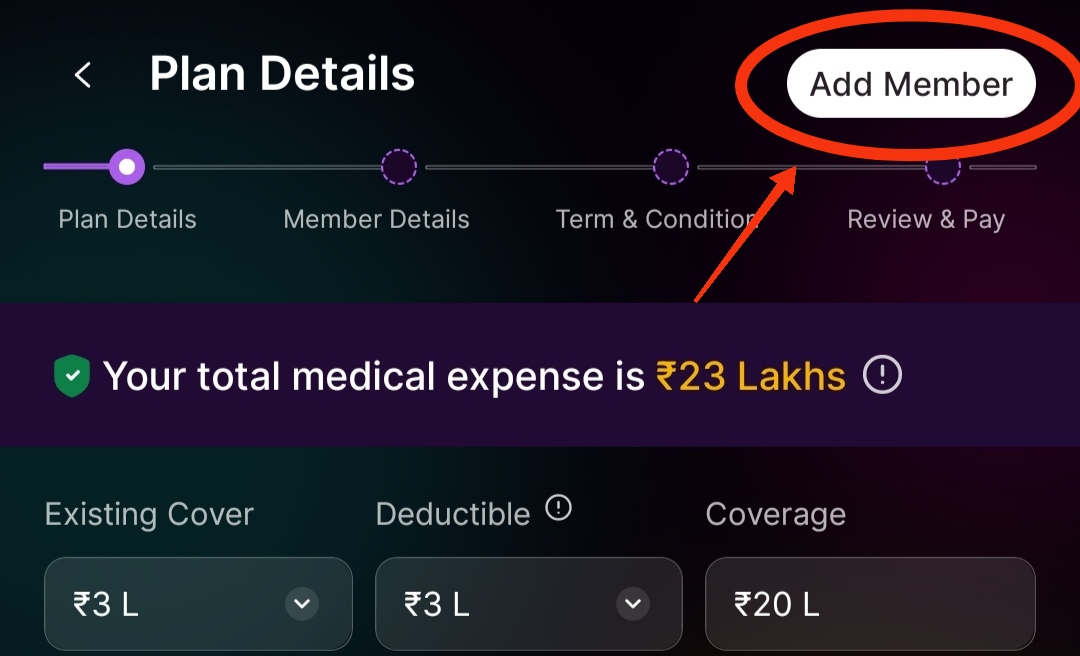 6. Now select the details of your existing coverage, deductible, and coverage for Super top-up. Based on that, you will be suggested different plans.