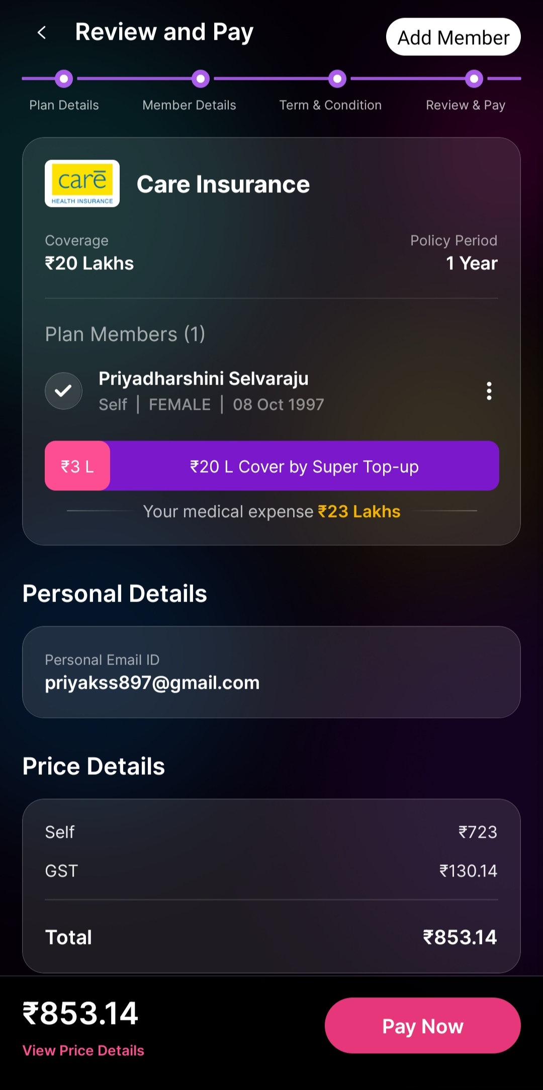8. You can always add members to your Super top-up policy by clicking on "Add member" option in the top right corner.