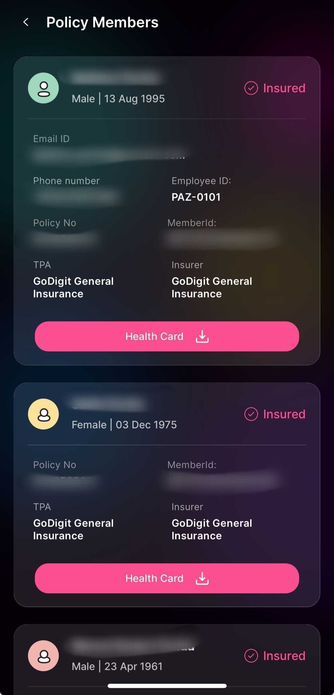 2. Here you will see the basic policy details for the members covered in the policy and an option to download the health card. Click on the "health card" option.