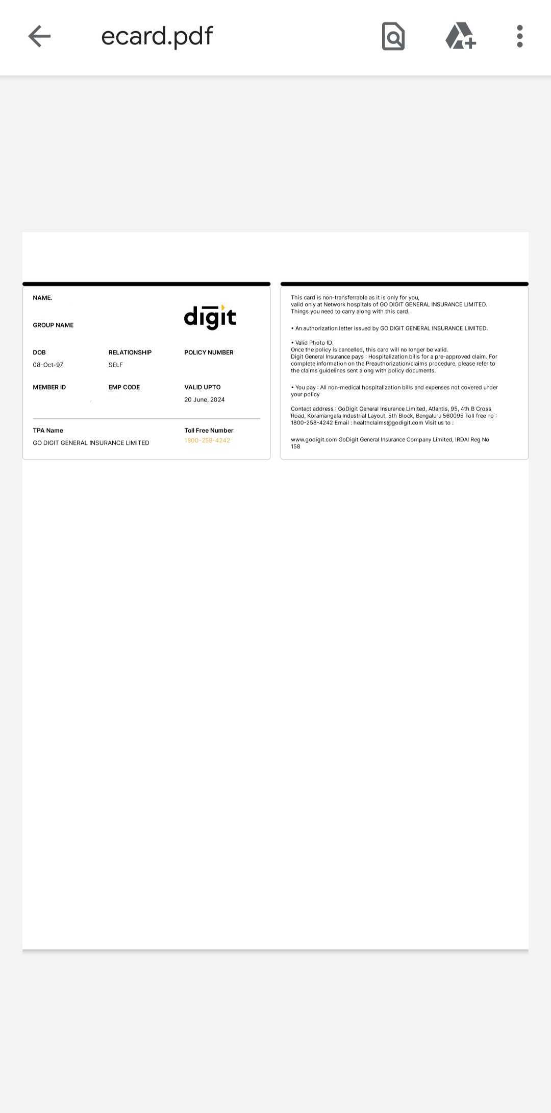 A Health card is like an insurance identity proof with all your personal details, and policy information, under your insurance plan. With a health card, you can get a cashless experience at network hospitals and don’t have to go through the reimbursement claim process.