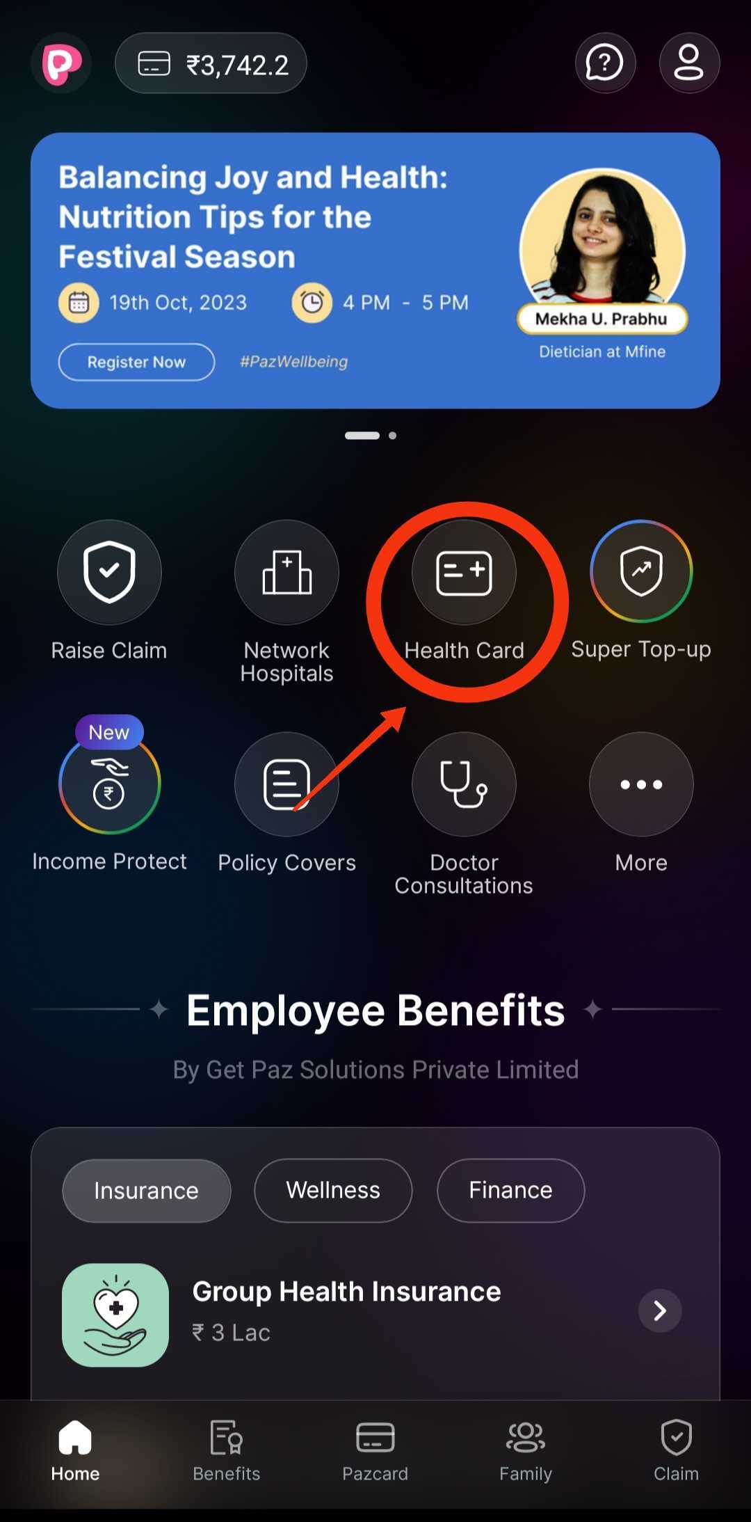 1. Log in to your Pazcare app with your registered mobile number and OTP. Once logged in, click on "Health card" option on the home page.